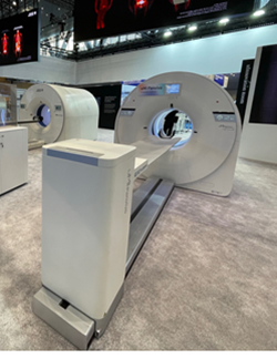 La déclinaison de la gamme uMI Panvivo (la version avec un champ de vue axial de 30 cm était sortie l’année dernière) : avec les modèles suivants : uMI Panvivo S (24 cm), uMI Panvivo ES (53 cm), uMI Panvivo EX (71 cm), uMI Panvivo LS (107 cm), uMI Panvivo FX (143 cm). Ils bénéficient tous d’un refroidissement à air et d’une caméra de positionnement 3D. La résolution temporelle TOF annoncée pour ces dispositifs est de 219 ps, leur sensibilité effective pourra aller jusqu’à 181 cps/kBq suivant les modèles. Le scanner couplé reste le même : il s’agit de l’uCT780 (tunnel de 70 cm, couverture en z : 4 cm, 160 coupes, vitesse 0,30 sec/rotation). Le marquage CE est attendu en 2026 et des upgrades entre les différents modèles seront possibles.
